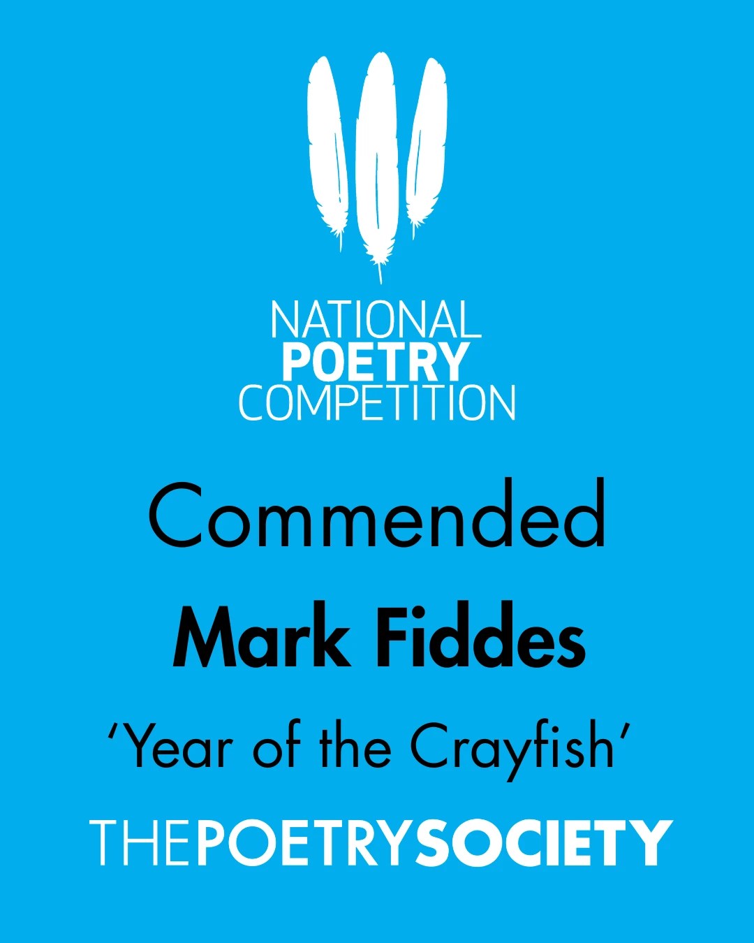 Poem ‘Year of the Crayfish’ selected from 21,250 entries as ‘Commended’ by judges Denise Saul, Ian Duhig and Susannah Dickey for the UK’s annual National Poetry Competition hosted by the Poetry Society.